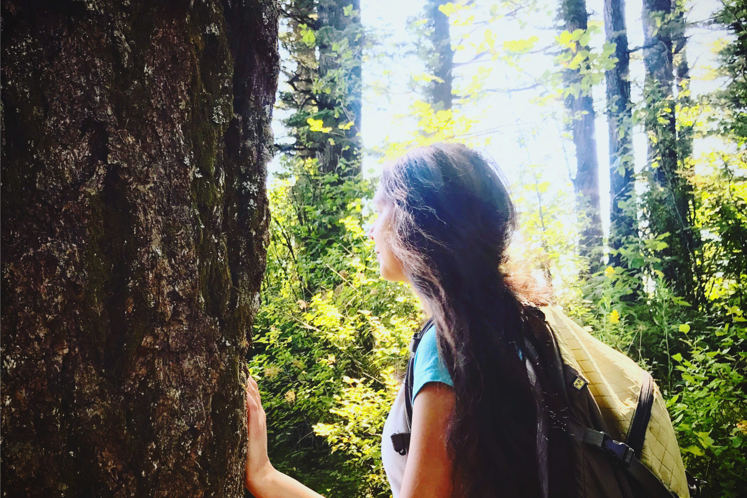 Our hike leader led us high along the forest trail. At last she said, “Okay, guys. Lean your heads back. Look up to the highest branches. Squinch your eyes. Can you see how different everything looks?”